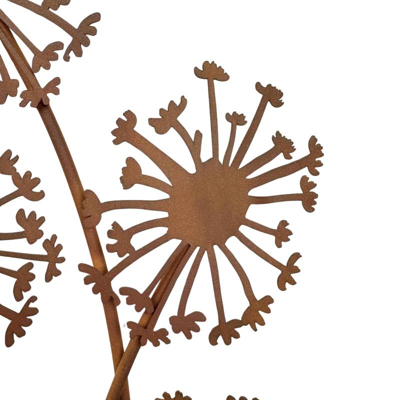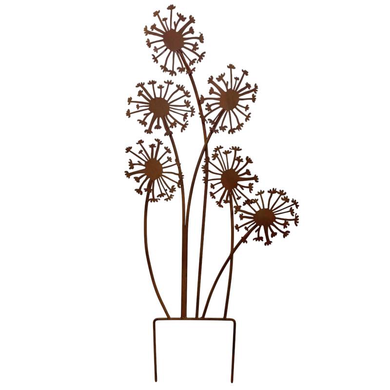 Monté sur une fourche et entièrement composé d'acier patiné couleur rouille, ce tuteur arbore six pissenlits. Un motif charmant qui viendra animer avec douceur votre décoration extérieure !