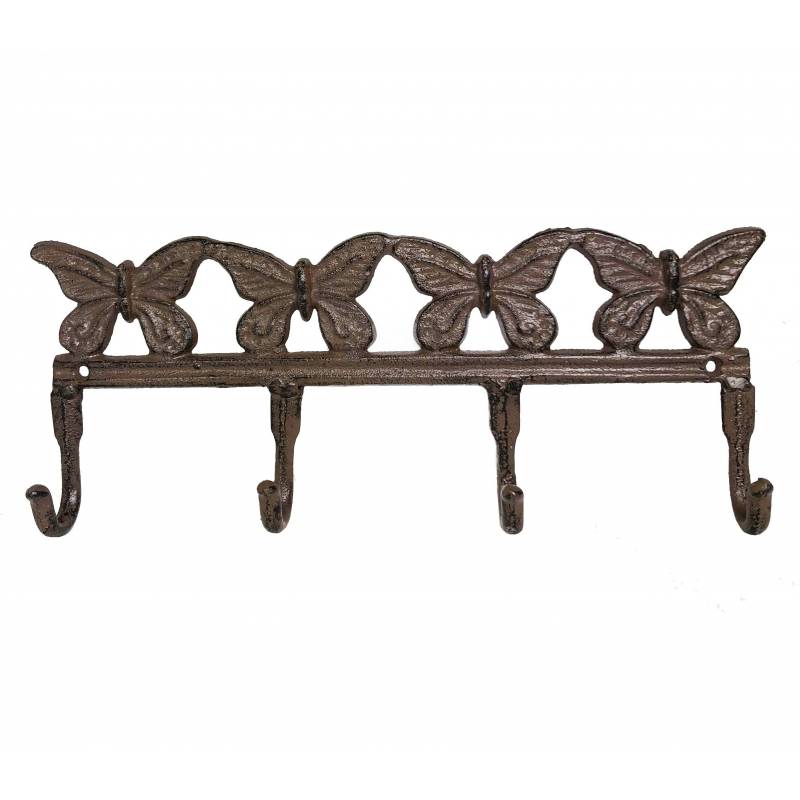 Jolie et grande patère à quatre crochets, décorée tout en légèreté de motifs papillons. Réalisé tout en métal patiné marron, ce porte manteaux est d'une grande solidité.