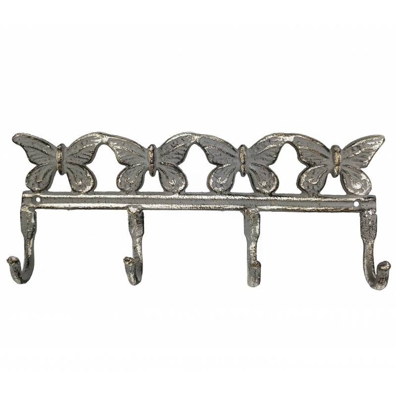 Jolie et grande patère à quatre crochets, décorée tout en légèreté de motifs papillons. Réalisé tout en métal patiné gris, ce porte manteaux est d'une grande solidité.