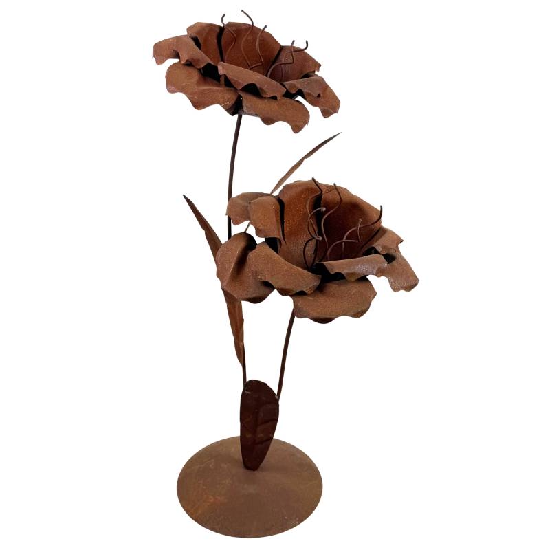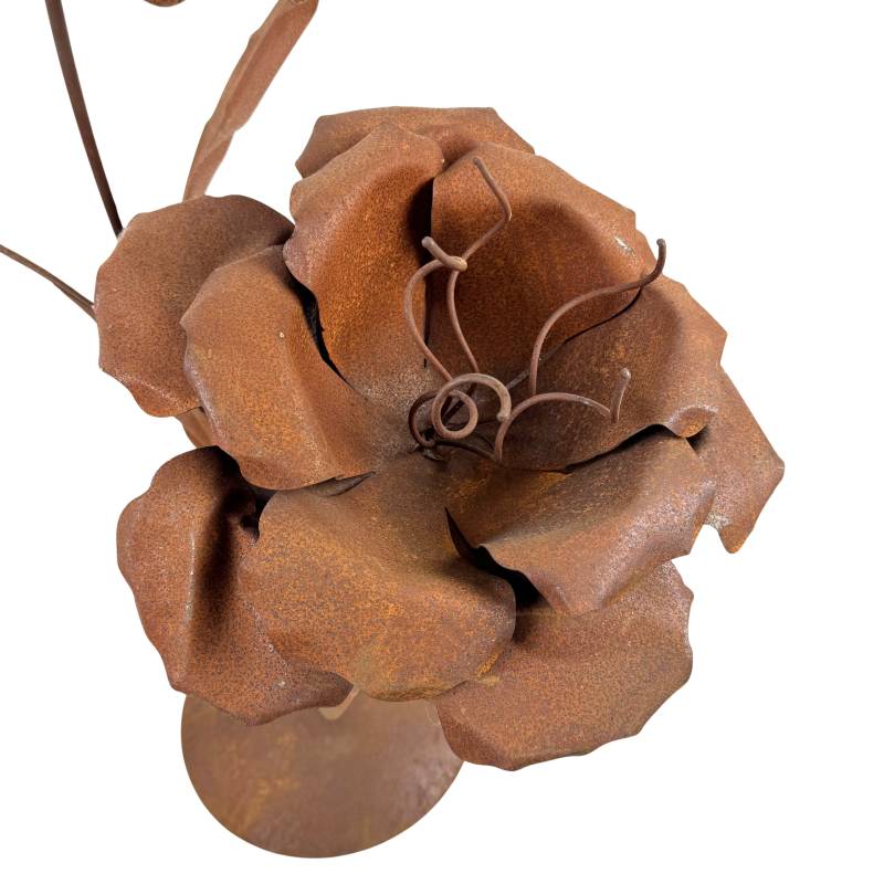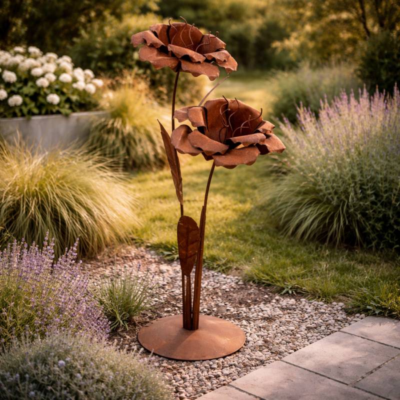 La composition de cette décoration de jardin repose sur deux fleurs à niveaux différents, créant du relief et du rythme visuel. Une fleur principale, plus haute, qui structure l’ensemble et une seconde légèrement plus basse, pour un effet asymétrique naturel.